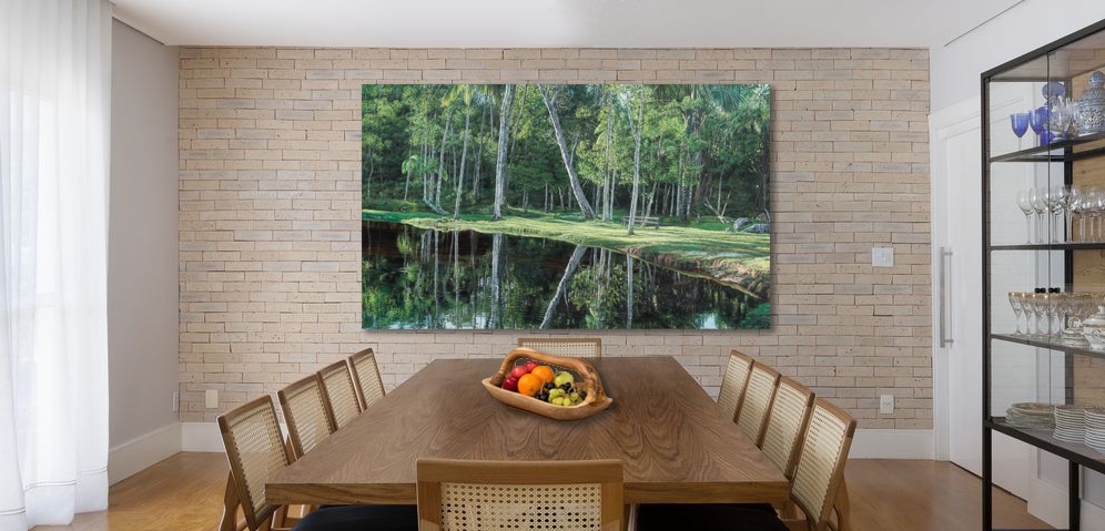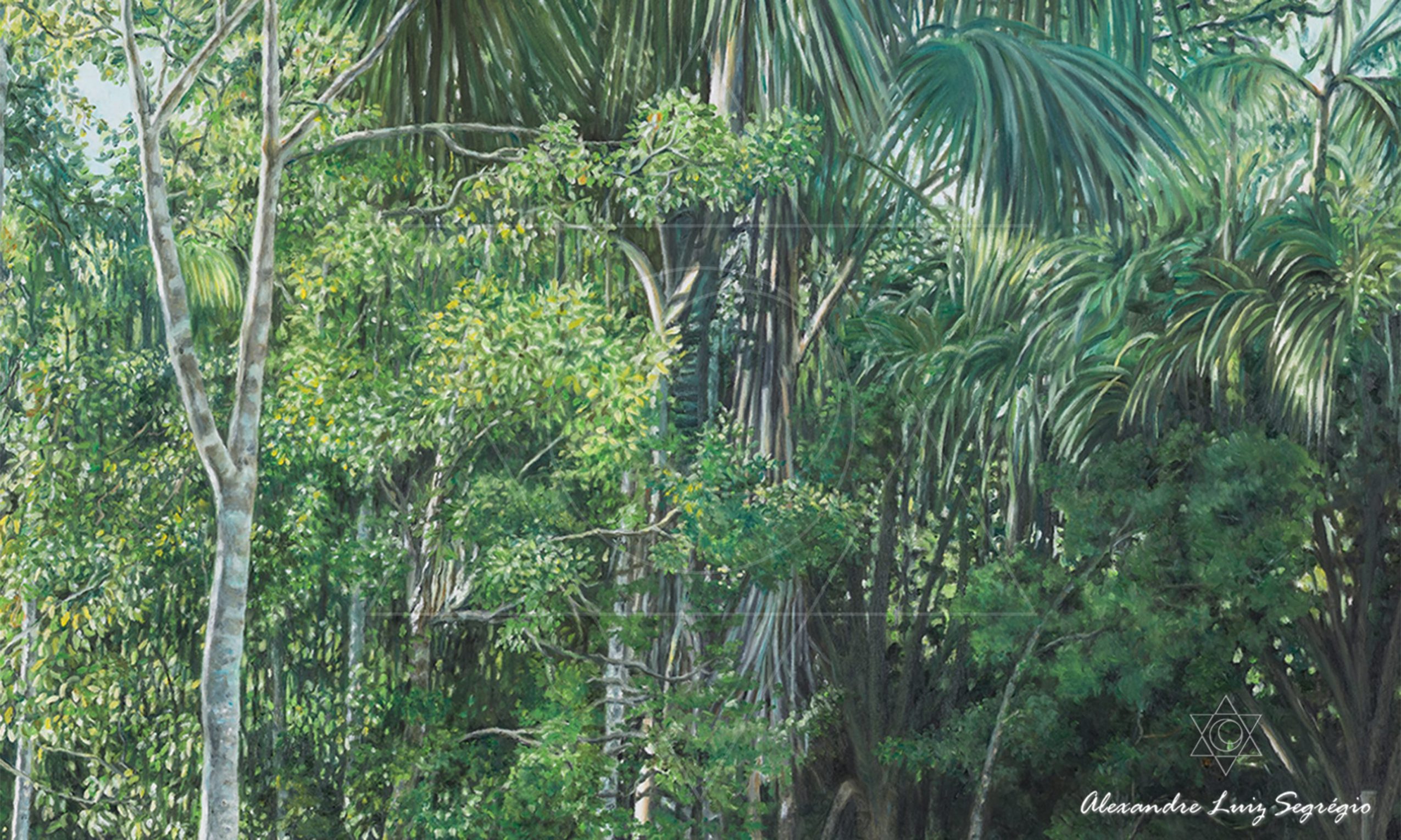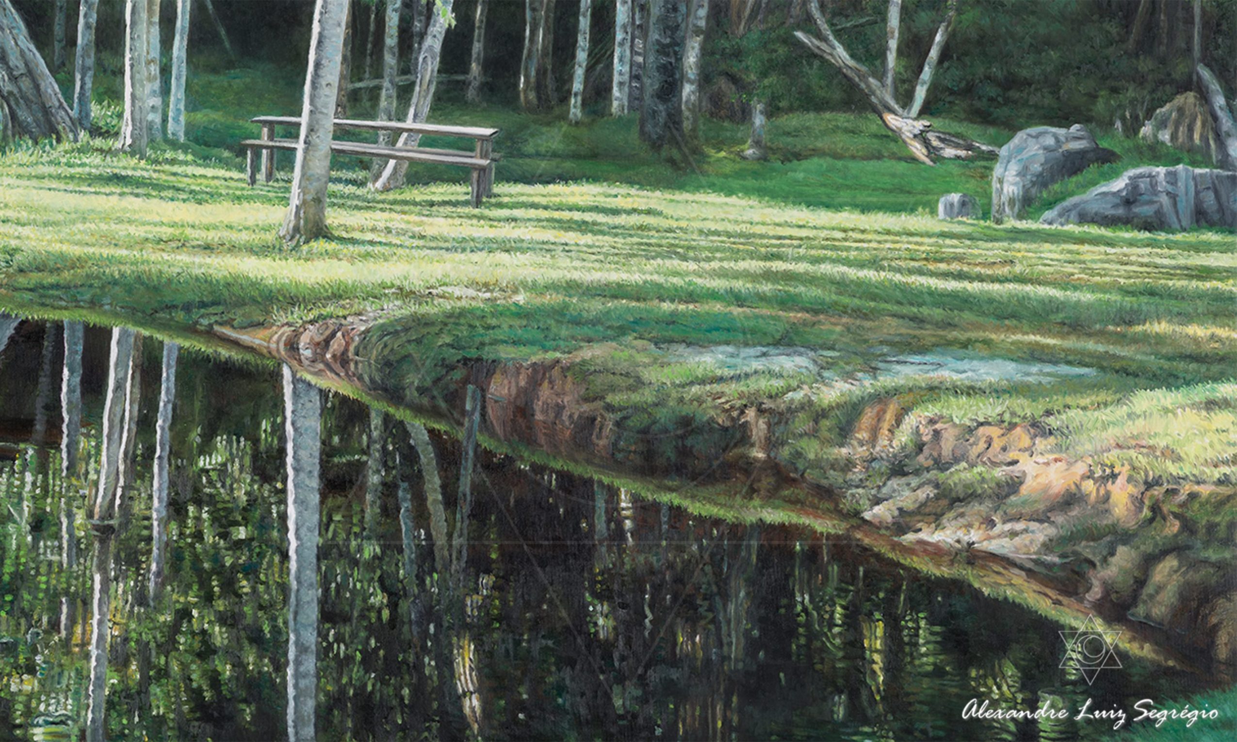 Pintura hiper-realista de um espelho d’água, refletindo algumas arvores da Floresta da bacia Amazônica na cidade de Cruzeiro do Sul, Acre. Sítio do amigo Tião.