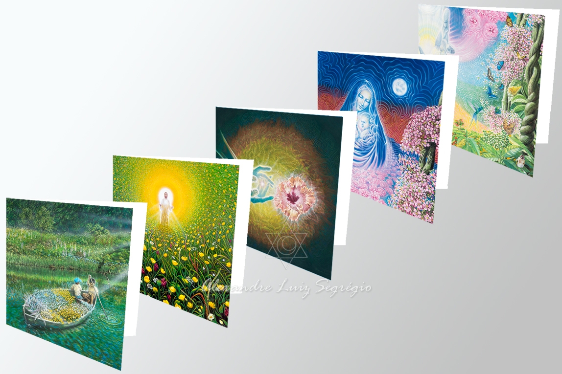 5 Cartões 20 x 20 cm – aberto 20 x 40 cm, Série Encantos completa, “Colheita”, “Encantos da Natureza Divina”, Luz na Terra”, “Rei dos Encantos 1” e “Rei dos Encantos 2”, imagens das pinturas do artista visionário Alexandre Luiz Segrégio.